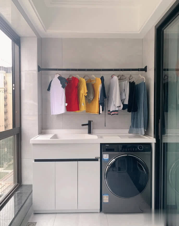 A.投入一台独立的热泵式烘干机;(衣服尽可能烘干,就不用再“麻烦”阳台晾衣架了。不过不建议大家选洗烘一体机,很鸡肋!选择独立热泵烘干机或者洗烘套装,都可以)